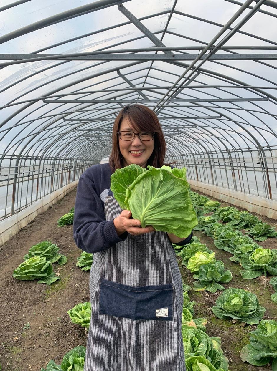 - 国道から数キロ先へ車を走らせると閑静な農業地帯が広がっていた。さらに細い農道を進むとたくさんの細長いハウスが見えてきた。出迎えてくれたのは春キャベツ農家の齊藤 靖子さんだ。ハウスは全部で11棟。そのうち3棟で春キャベツを栽培している。1棟のハウスから約3000本の春キャベツの収穫を目標にしている。ハウスは縦に細長く天井が低い。今までに見たことのない形だ。