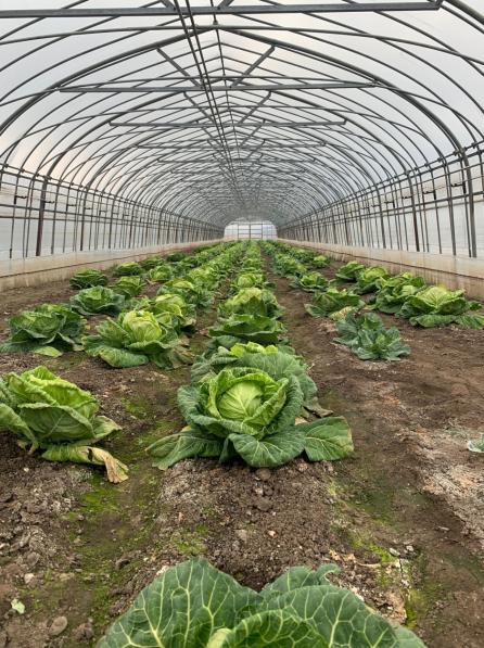 さらに雪につぶされないよう、ハウス内に補強パイプを入れ頑丈にしている。アーチ状に均一に配置されたパイプと、細長く整列した瑞々しい緑の春キャベツはとても美しく、このハウスの造りだけでも非凡なセンスが感じられる。