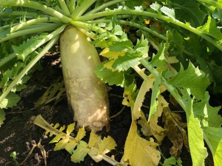 - 実際におでん大根を土から抜いてもらった。淵澤さんがうっと力をこめ、土からおでん大根を掘り起こす。3kgはあるだろう大きく立派な大根が姿をあらわした。